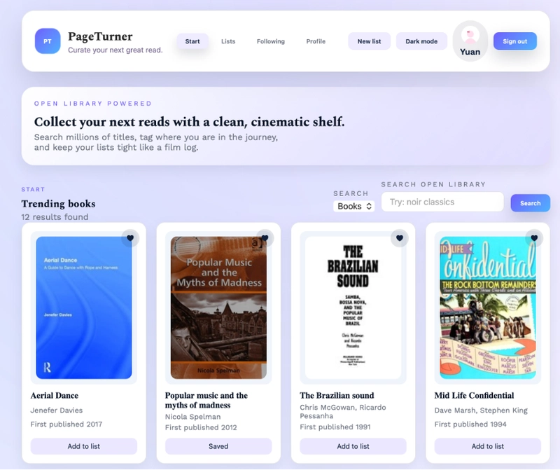 A social reading platform where users create accounts, maintain book lists, follow other readers, write reviews, and track reading progress. Built in just 48 hours with Codex AI—a task that previously took a team of four one month.